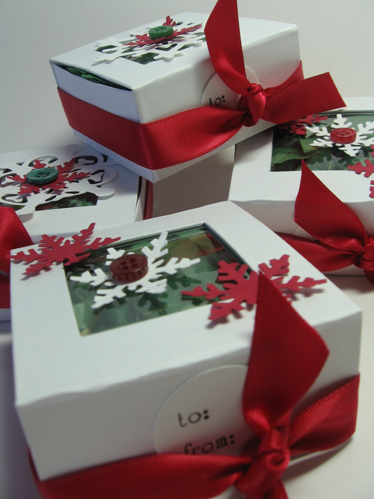 I spent all afternoon packaging the caramels I made the other day. I had these white boxes leftover from a project so I tied some ribbon on them and added some snowflakes. Here's a few blue ones I made, too.